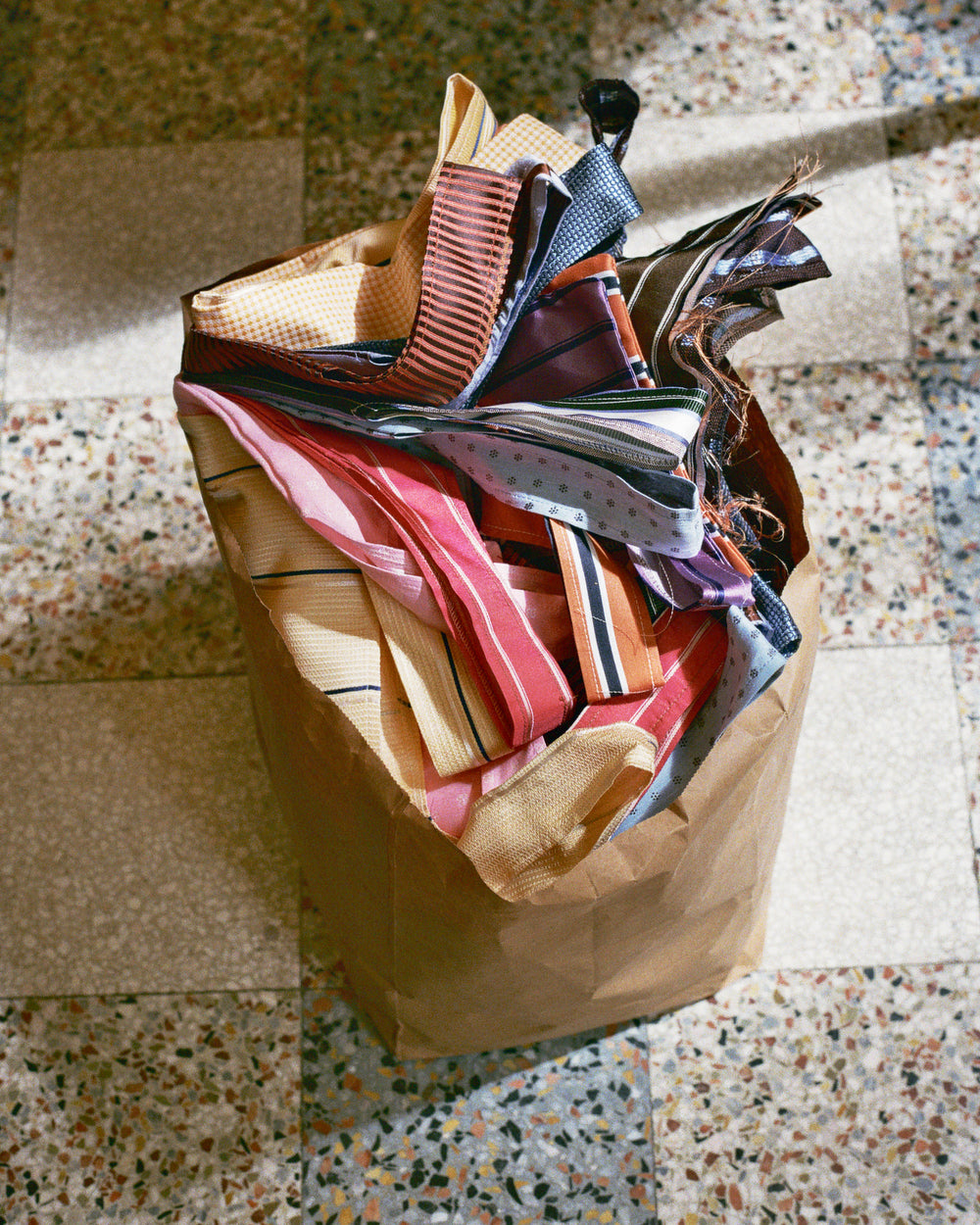 Crafted from upcycled tie fabrics, it transitions effortlessly from packaging to a chic accessory.